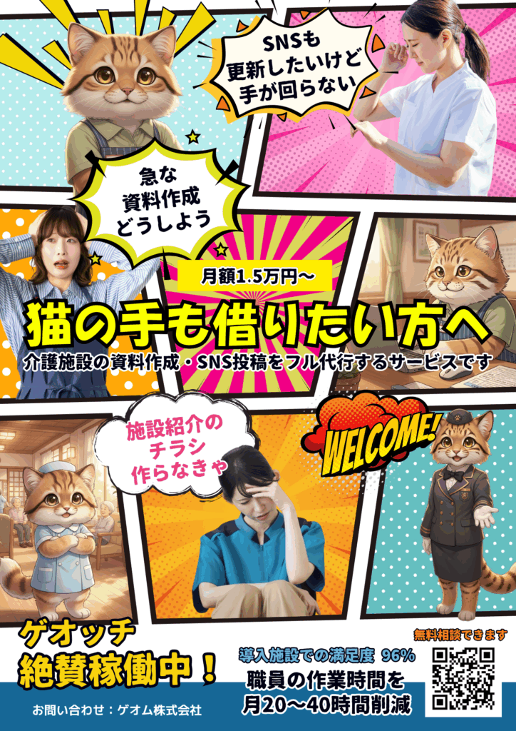 ゲオッチは、介護施設の資料作成・SNS投稿などを代行するコンシェルジュ・サービスです。新規の資料作成にも対応し、すでに作成した資料をブラッシュアップ(修正)することも可能です。