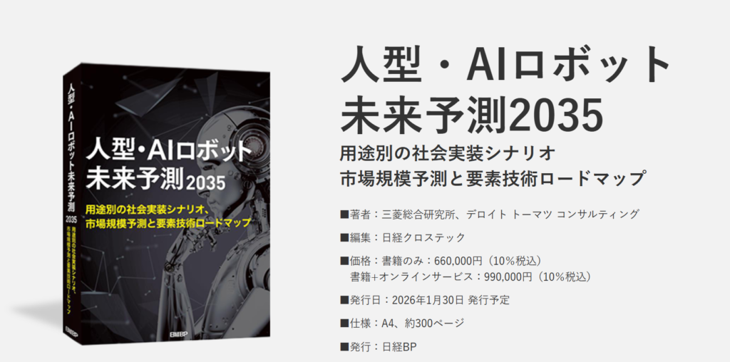 Corporate お知らせ|「人型・AIロボット未来予測2035」掲載のお知らせ 2025.12.12 2026年1月30日発行予定の「人型・AIロボット未来予測2035」において、現在弊社が研究開発を行っております「認知症対応型AI×見守りロボット」の特集が掲載される予定です。 ぜひご覧いただければ幸いです。 発行元(日経BP)サイト favorite0いいね送信中です×※コメントは最大500文字、5回まで送信できます送信送信中です送信しました! Post Share Hatena Line RSS feedly Pin it note
