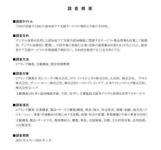 Corporate 調査レポート「DXが加速するMCI・認知症ケア支援サービスの現状と今後の方向性」掲載のお知らせ 2026.02.12 株式会社株式会社シード・プランニングによる調査書「DXが加速するMCI・認知症ケア支援サービスの現状と今後の方向性」(2026年1月末発行)において、当社及び当社製品が紹介されております。 以前より、本調査書に掲載するための「認知症ケア支援サービス」に係る情報提供を行ってまいりました。 本調査レポートはこちらから購入が可能です。 favorite0いいね送信中です×※コメントは最大500文字、5回まで送信できます送信送信中です送信しました! Post Share Hatena Line RSS feedly Pin it note
